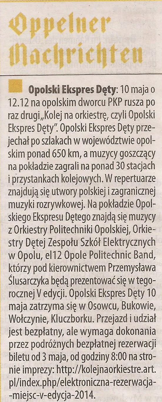 > NTO, 29.03.2014, autor: Anna Grudzka, Opolski Ekspres Dęty wyruszy 10 maja