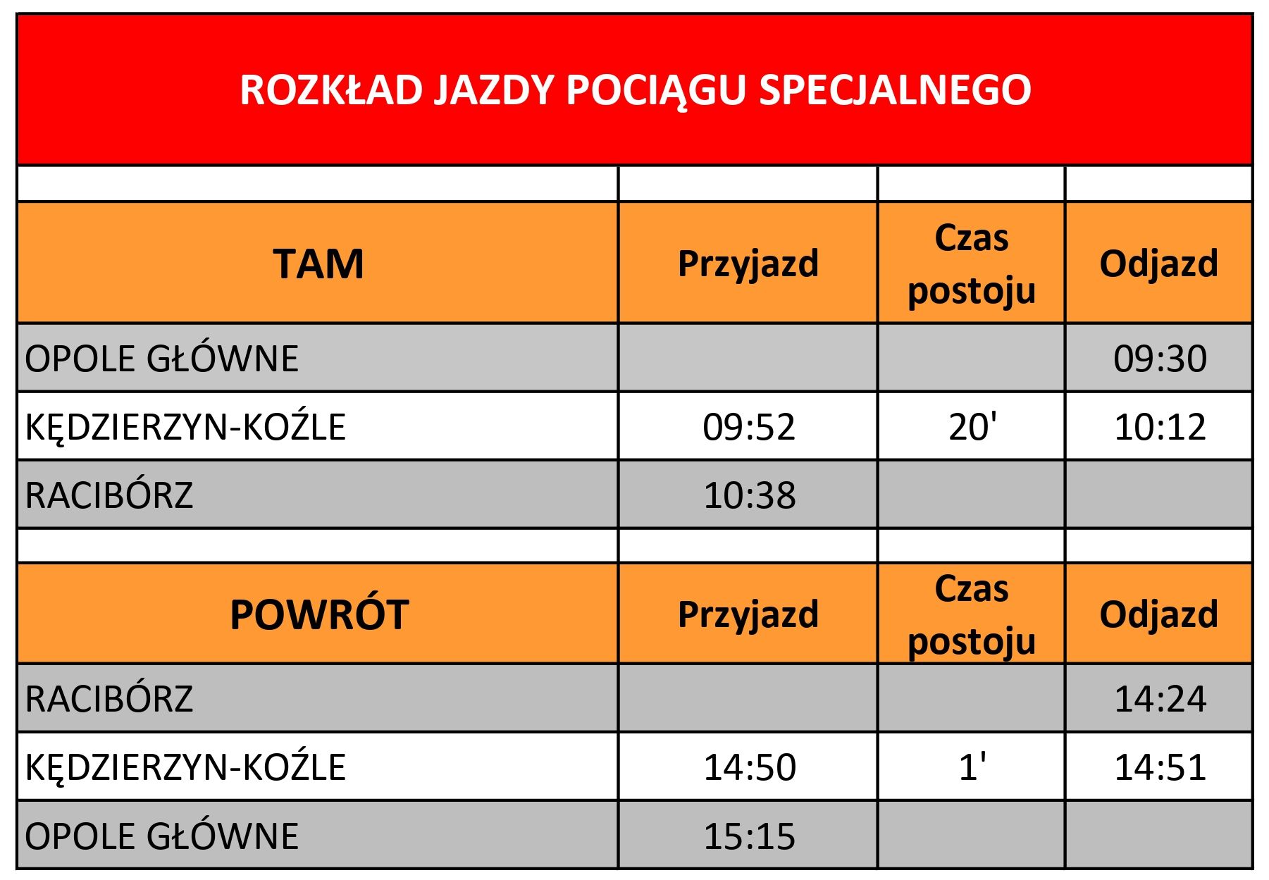 Przejazd Opolskim Ekspresem Dętym w dniu 09 maja 2026 roku odbywa się wyłącznie na podstawie bezpłatnego, specjalnego biletu - miejscówki w poniższej relacji pociągu.